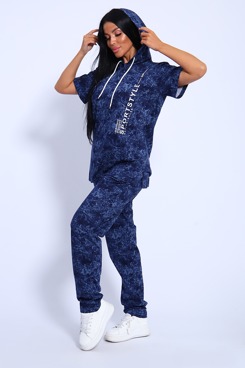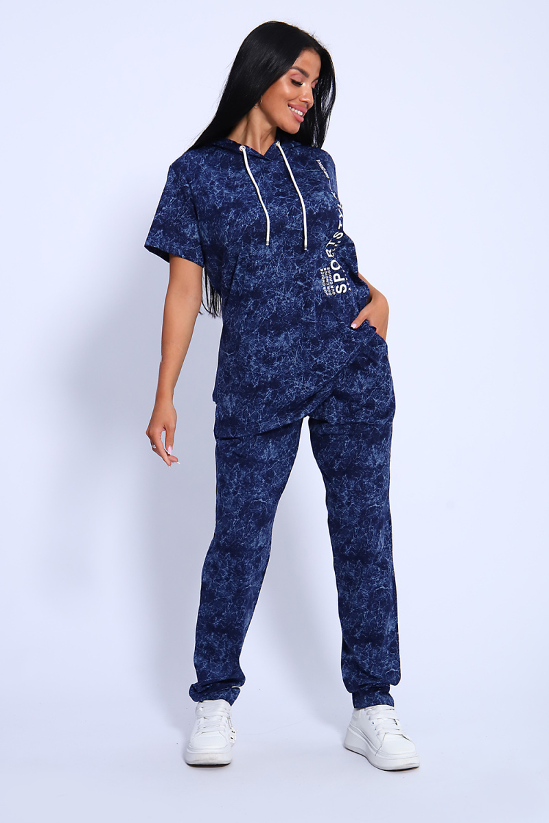 Яркий и стильный женский костюм из легкого дышащего трикотажного полотна высокого качества. Изюминкой костюма является рисунок ткани, имитирующий "вареную" джинсовку. для удобства модниц изделие представлено в 4-х ярких расцветках. На кофте имеется капюшон, объем которого регулируется тонкой лентой. Этот универсальный и практичный повседневный костюм в спортивном стиле будет удобным и комфортным во многих ситуациях. Комплект отлично подойдет для спорта, бега или танцев. Брюки свободные, с двумя боковыми карманами, на широком поясе с резинкой. Каждую вещь вполне можно использовать по отдельности. Комплект отлично подойдет для женщин любого возраста и поможет хозяйке выглядеть стильно, при этом даря чувство комфорта!